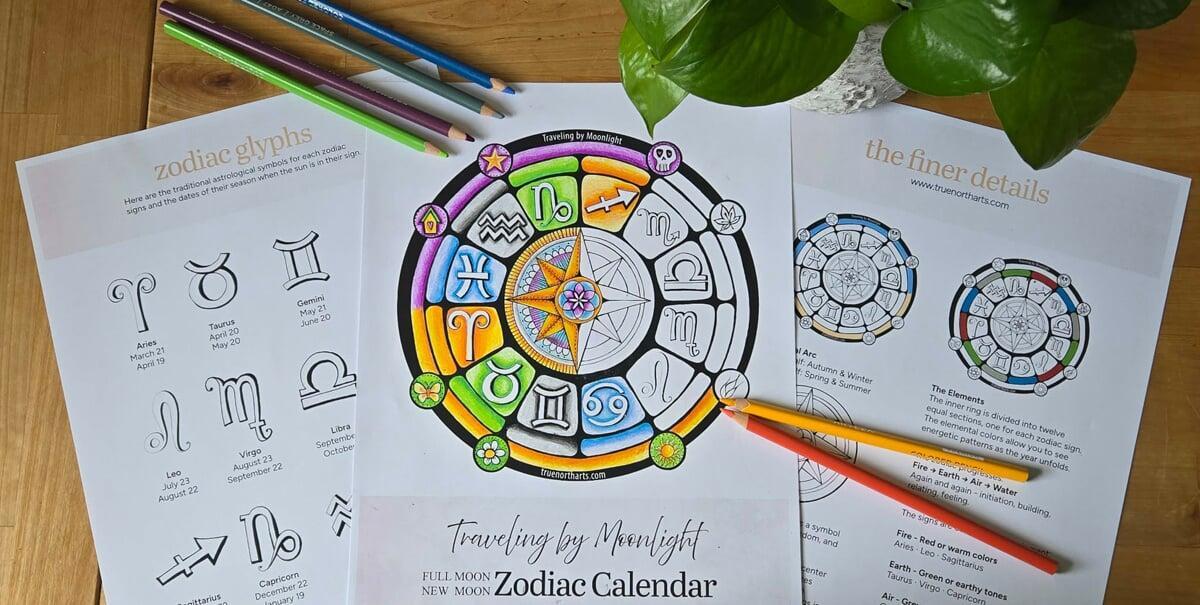 • A circular zodiac calendar to track each new moon and full moon